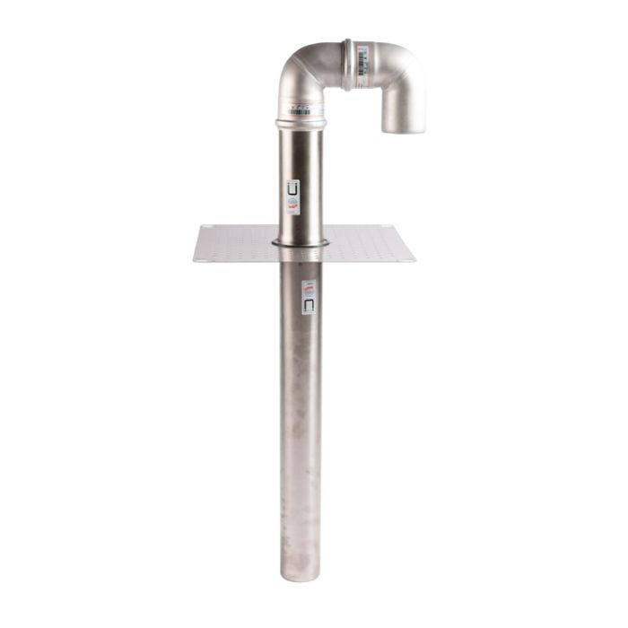 Svanhals ø 75 och 110 Rostfri, Höjd 350 resp. 430 mm perforerad fläns 400x400 mm. Används för kabelgenomföringar mellan inner- & yttertak